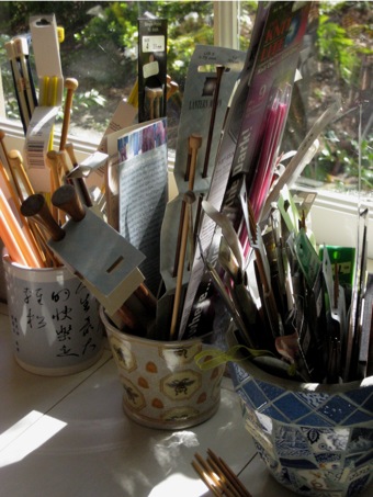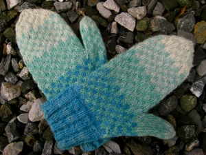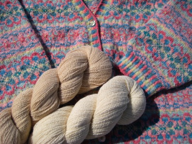 Below left you will see a Fair Isle sweater knitted with                                dyed white and fawn yarns. The bright pinks and yellows and light blues were done with the white. The teals, greens and darker pinks were done with the fawn yarn.