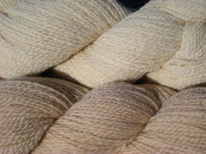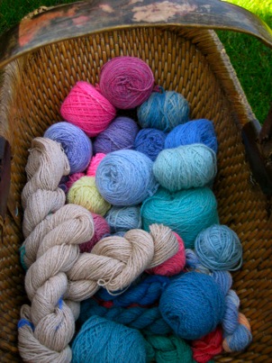 The basket of yarn is an example of several colors. The bright pink at the top left and the bright yellow (next to the baby blue) were dyed with white yarn. The rest are on the tan yarn (see the skeins in the lower left?). As you can see, the tan yarn produces lovely, subtle colorings that are flattering to most people.